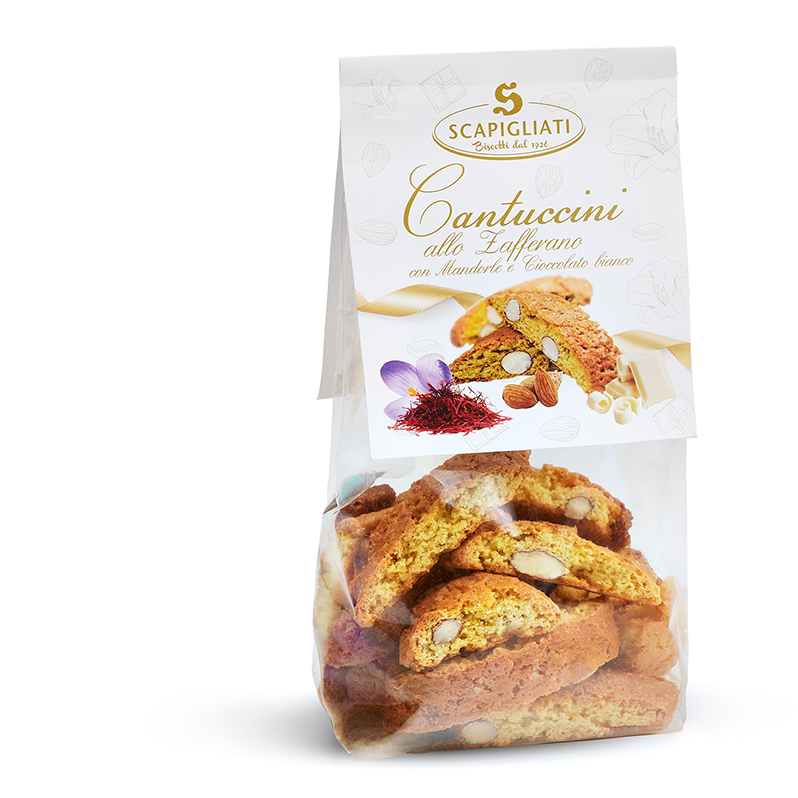Cantuccini di insolito colore giallo, dovuto ad un accostamento inedito, che intreccia la morbidezza e dolcezza del cioccolato con l’aroma inconfondibile dello zafferano, la spezia che da secoli viene detta “oro vegetale”.